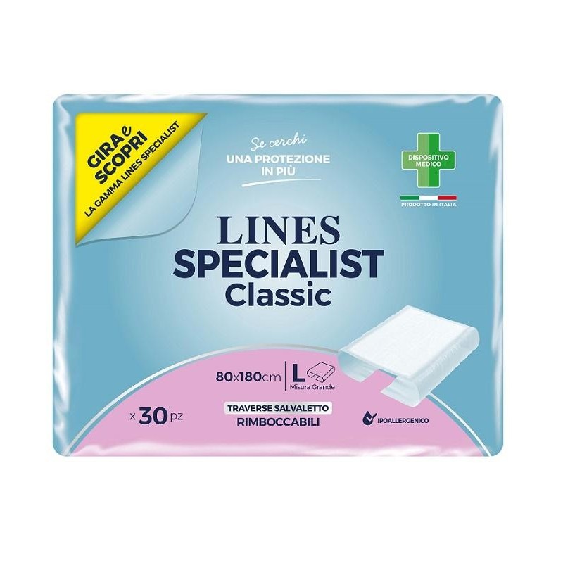 LINES SPECIALIST Classic Descrizione Tampone assorbente di polpa di cellulosa, disposto nella parte centrale del prodotto. Particolare attenzione viene prestata alla formazione del materassino assorbente utilizzando uno stampo specifico che dà allo stesso una forma ed un profilo altamente definiti. Lo stesso stampo è progettato in modo da garantire un’omogenea ed adeguata distribuzione del materiale assorbenti. L’uniformità dello stampo garantisce una formazione del materassino assorbente in totale conformità con le specifiche tecniche di prodotto e relativa produzione. Il prodotto così disegnato fa da barriera ad eventuali perdite che si possono verificare nell’uso dell’ausilio assorbente proteggendo lenzuola e materasso. Componenti Materiale assorbente: tampone assorbente di polpa di cellulosa; rivestimento esterno: materiale impermeabile atossico, tale da costruire una barriera ai liquidi, in polietilene. Formato 30 pezzi da 800 x 1.800 mm. Peso totale: 58 g. Cod. 2750413
