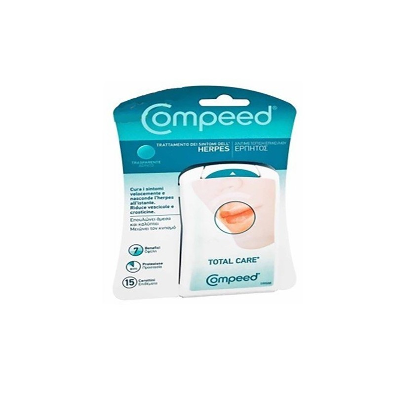 Compeed HERPES TOTAL CARE Cerotto adatto per curare i sintomi dell’herpes durante tutte le fasi dell'eruzione, esercita un'azione veloce e quasi invisibile diminuendo i disagi fisici e relazionali causati dall’herpes labiale. Modalità d'utilizzo Applicare il cerottino al primo segno di eruzione spesso rappresentato dalla sensazione di formicolio o prurito. Come applicarlo: lavarsi le mani. Assicurarsi che la pelle sia pulita e asciutta. Non utilizzare con altre creme perché il cerottino potrebbe non aderire in maniera ottimale alla pelle e non offrire tutti i benefici del trattamento. Estrarre l'applicatore dalla bustina e tenere le estremità dell'applicatore usando entrambe le mani. Tirare delicatamente le due linguette interne dell'applicatore, seguendo il senso delle frecce, fino a scoprire la parte adesiva di metà cerottino. Prestare attenzione a non toccare la parte adesiva del cerottino. Applicare la parte adesiva sull'herpes e premere delicatamente con le dita sulla metà applicata per farla aderire bene. Tirare lentamente la linguetta verso il basso fino a quando il cerottino aderirà in maniera ottimale al labbro e l'applicatore scivolerà via. È possibile applicare il make-up sul cerottino. Lavarsi le mani dopo l'applicazione. Come rimuoverlo: appena il cerottino comincia a staccarsi dalla pelle può essere rimosso e sostituito con uno nuovo. Se il cerottino resta attaccato, non è necessario rimuoverlo per cambiarlo. Per rimuovere il cerottino, tirare lievemente i bordi con entrambe le mani, in direzioni opposte, ed allungarli delicatamente fino a completo scollamento. I cerottini devono essere utilizzati 24 ore su 24, fino a completa guarigione dei sintomi dell’herpes. Il cerottino rimane applicato per circa 8 ore e poi dovrà essere sostituito con uno nuovo. La durata dell’applicazione del cerottino può variare da soggetto a soggetto. Non rimuovere il cerottino pensando sia necessario che la ferita “respiri”: potrebbe risultare controproducente ed allungare il processo di guarigione. Mantenere il cerottino al suo posto favorisce il mantenimento di un ambiente ottimale per una veloce guarigione dei sintomi dell’herpes labiale. Formato Confezione da 15 pezzi. Cod. 4243300
