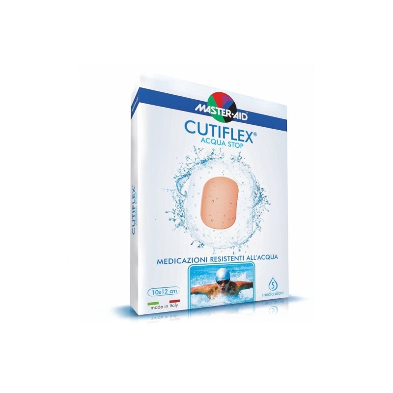 MASTER•AID CUTIFLEX         ACQUA STOP Dispositivo medico CE 0373. Medicazione in poliuretano, flessibile, elastica, sottilissima (20 micron) e trasparente che aderisce in modo ottimale (come una seconda pelle) e protegge la ferita anche in caso di immersione totale in acqua. CUTIFLEX protegge la ferita dagli agenti esterni e favorisce il processo di guarigione mantenendo umido l'ambiente sotto la medicazione senza causare macerazione. • Collante ipoallergenico, adatto a tutti i tipi di pelle, anche quelle delicate di bambini e anziani. Elevata adesività, anche durante l'immersione in acqua. Privo di lattice di gomma naturale. • Supporto con angoli arrotondati per una elevata conformabilità del prodotto e aumento del comfort per l'utilizzatore. Film 100% di poliuretano trasparente (20 micron). • Tampone Centrale con strato antiaderente a contatto con la ferita. Elevata capacità assorbente. Forma arrotondata per una migliore conformabilità alla ferita. Di colore pelle per rendere la medicazione quasi invisibile. Formato - 7x5 cm. Confezione da 5 pezzi. - 10x6 cm. Confezione da 5 pezzi. - 10x8 cm. Confezione da 5 pezzi. - 10x12 cm. Confezione da 5 pezzi. - 10,5x15 cm. Confezione da 5 pezzi. - 10,5x20 cm. Confezione da 5 pezzi. - 12,5x12,5 cm. Confezione da 5 pezzi. - 14x14 cm. Confezione da 5 pezzi. - 15x17 cm. Confezione da 3 pezzi. Cod. 01160 / 01162 / 01164 / 01166 / 01168 / 01170 / 01172 / 01175 / 01177