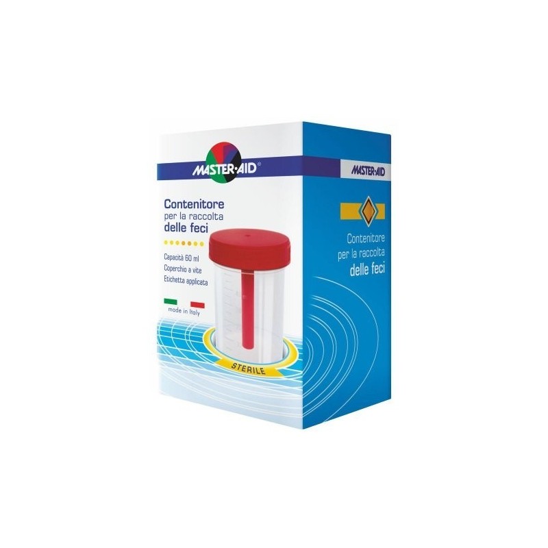 MASTER•AID Contenitore per la raccolta delle feci Prodotto per le analisi coprologiche, con cucchiaino, coperchio a vite ed etichetta adesiva preapplicata per l'identificazione del campione. Sterilizzato a raggi beta. Dispositivo IVD. Formato 60 ml Cod. 90125