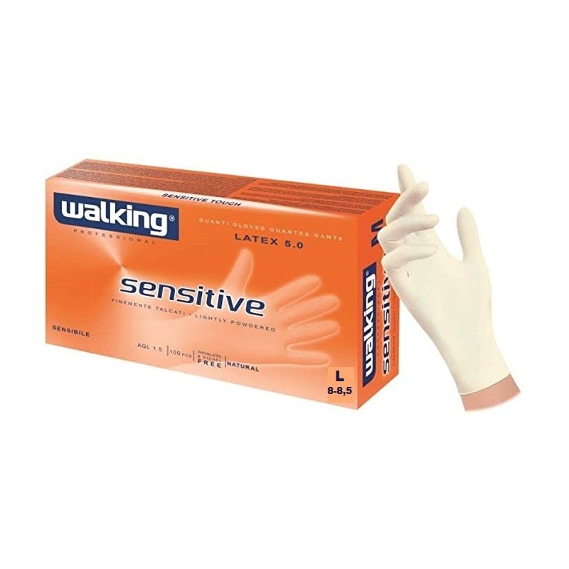 - Guanto monouso Walking Sensitive professionale in lattice colore bianco latte. Con polvere interna, peso 5.0 gr (M) caratterizzato da un'ottima sensibilità al tatto.