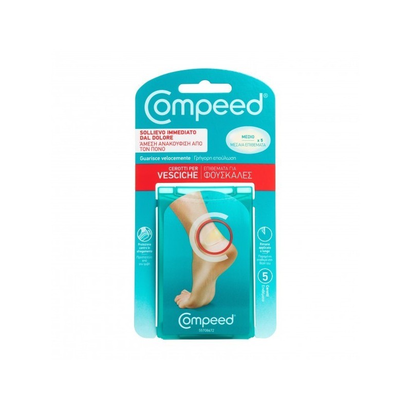 COMPEEDCEROTTI PER VESCICHEMEDIO DescrizioneSollievo immediato dal dolore, guarisce velocemente. La tecnologia dell'Idrocolloide Compeed è costituita da microparticelle in grado di assorbire l'umidità dalla vescica. Compeed agisce come una seconda pelle e aiuta e riequilibrare il naturale livello di umidità per donare sollievo immediato dal dolore, proteggere contro lo sfregamento e accelerare la guarigione. Resta applicato sulla pelle per diversi giorni. La durata può variare da soggetto a soggetto.Modalità d'usoPrima dell'uso assicurarsi che la zona intorno alla vescica sia pulita ed asciutta, senza residui di creme e/o oli. Rimuovere le due linguette di carta che proteggono Compeed avendo cura di non toccare la parte adesiva.Applicare Compeed direttamente sulla vescica, assicurandosi che i bordi aderiscano bene alla pelle.Lasciare Compeed applicato fin quando non si stacca da solo. Potrebbe rimanere applicato per diversi giorni.Per una più facile rimozione non tirare Compeed verso l'alto ma allungare delicatamente il bordo parallelamente alla pelle.AvvertenzePer i diabetici consultare il proprio medico prima dell'utilizzo. Non applicare sulle ferite infette.Non riutilizzare perché può causare infezioni.Non tagliare mai il cerotto Compeed.Eventuali residui di adesivo su calze o scarpe possono essere rimossi con alcool, tenendo conto delle specifiche istruzioni del tessuto.Se la vescica peggiora e non guarisce, interrompere l'applicazione e consultare il medico.ConservazioneValidità a confezionamento integro: 36 mesi.FormatoConfezione da 5 cerotti.Cod. COBMZ300A