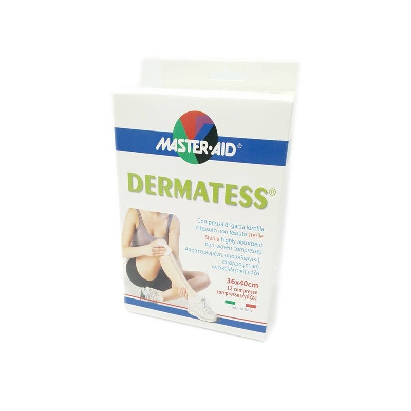 MASTER•AID DERMATESS Dispositivo medico CE 0373. Compressa morbida di garza sterile in tessuto non tessuto, monoestensibile. Grazie al tipo di tessuto non si attacca alla ferita, non spela, non si sfilaccia. Indicata come barriera per la compressione e/o l'assorbimento degli essudati. Adatte alla detersione, pulizia e disinfezione di ferite di ogni tipo e per la protezione di lesioni cutanee. Caratteristiche tecniche Garza in tessuto non tessuto in fibre 30% poliestere, 70% viscosa. Formato - 10x10 cm. Confezione da 25 o 100 pezzi. - 18x40 cm. Confezione da 12 pezzi. - 36x40 cm. Confezione da 12 pezzi. Cod. 30022 / 30025 / 30027 / 30029