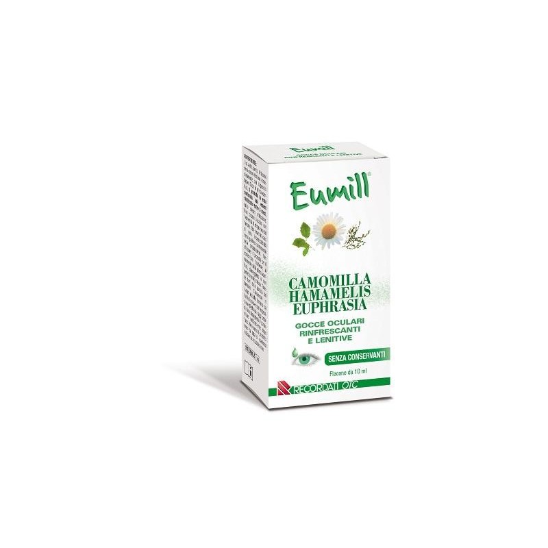 Eumill CAMOMILLA HAMAMELIS EUPHRASIA GOCCE OCULARI RINFRESCANTI E LENITIVE SENZA CONSERVANTI Prodotto contenente acqua distillata di Camomilla, Hamamelis ed Euphrasia. L'acqua distillata di Camomilla, Hamamelis e Euphrasia risulta indicata per alleviare affaticamento ed arrossamento agli occhi ed alla mucosa oculare. Indicato per alleviare affaticamento ed arrossamento agli occhi ed alla mucosa oculare causati da agenti atmosferici e da fattori ambientali (vento, salsedine, caldo eccessivo, inquinamento, fumo, pulviscolo), da eccessivo lavoro o studio ed uso prolungato del computer, da eccessiva esposizione alla luce e da attività sportiva, da uso prolungato di lenti a contatto. Modalità d'utilizzo Instillare 2/3 gocce in ciascun occhio ogni qual volta sia necessario. È indicato anche per uso frequente e prolungato. Dopo aver aperto la busta di protezione: 1. Separare un flaconcino monodose dalla barretta costituita da 5 contenitori. 2. Ruotare l’aletta ed estrarre il cappuccio di chiusura che può essere utilizzato per richiudere il contenitore. 3. Effettuare una leggera pressione sul corpo del flaconcino monodose ed instillare 2/3 gocce in ciascun occhio ogni qualvolta necessario. Componenti 100 ml di prodotto contengono: acqua distillata di Camomilla 10 g, acqua distillata di Hamamelis 10 g, acqua distillata di Euphrasia 10 g, sodio cloruro 0,8 g, sodio fosfato bibasico dodecaidrato 0,3 g, sodio fosfato monobasico monoidrato 0,03 g, EDTA 0,05 g, acqua quanto basta a 100 ml. Avvertenze Una volta aperto, il flacone deve essere richiuso immediatamente con l'apposito tappo. Dopo la prima apertura, il prodotto in esso contenuto può essere riutilizzato entro 3 mesi, dallo stesso utilizzatore. Non toccare l'occhio con l'estremità di erogazione del flacone. Non usare in caso di nota incompatibilità verso qualsiasi componente della preparazione. Non utilizzare il prodotto se il contenitore risultasse, al momento della prima apertura, danneggiato o non perfettamente chiuso. Tenere fuori dalla portata dei bambini. Conservazione Conservare in un luogo asciutto lontano da fonti di calore e dall'esposizione diretta dei raggi solari. Non disperdere il contenitore nell'ambiente dopo l'uso. Non usare il prodotto dopo la data di scadenza indicata sulla confezione. Formato Confezione contenente 2 bustine da 5 monodose ciascuna. Contenitore monodose da 0,5 ml richiudibile equivalente a circa 10 gocce.