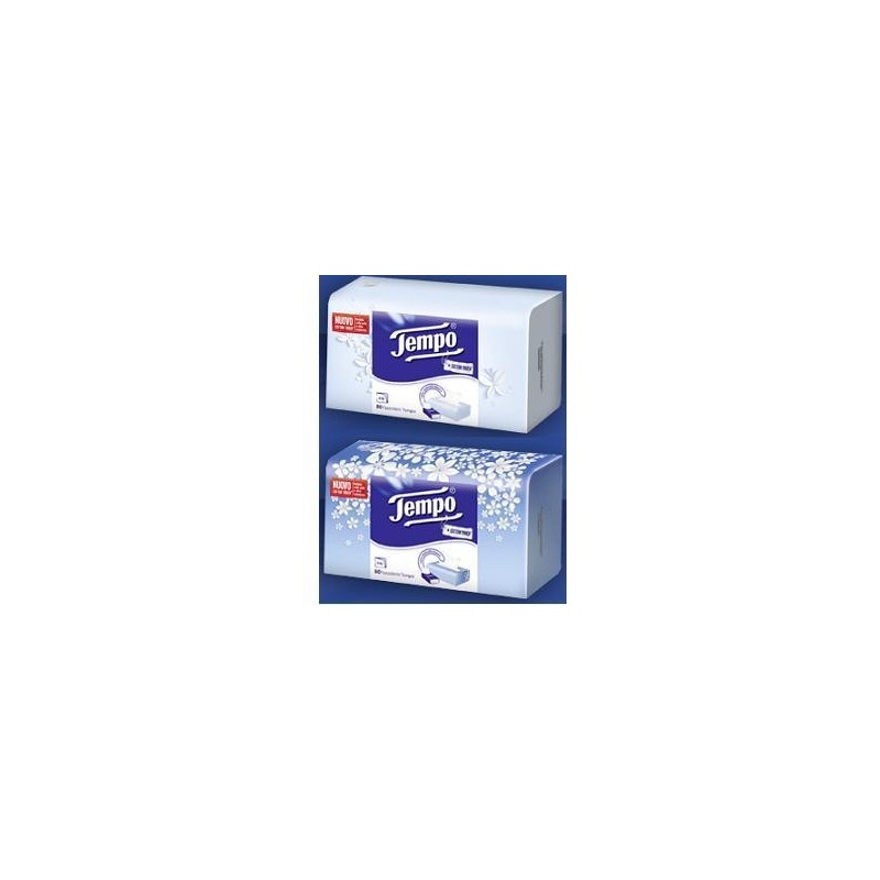 Tempo Fazzoletti esistenti e morbidi, arricchiti con fibre di cotone. 4 veli. Box in diverse grafiche. Formato Box da 80 fazzoletti. Cod. 836904