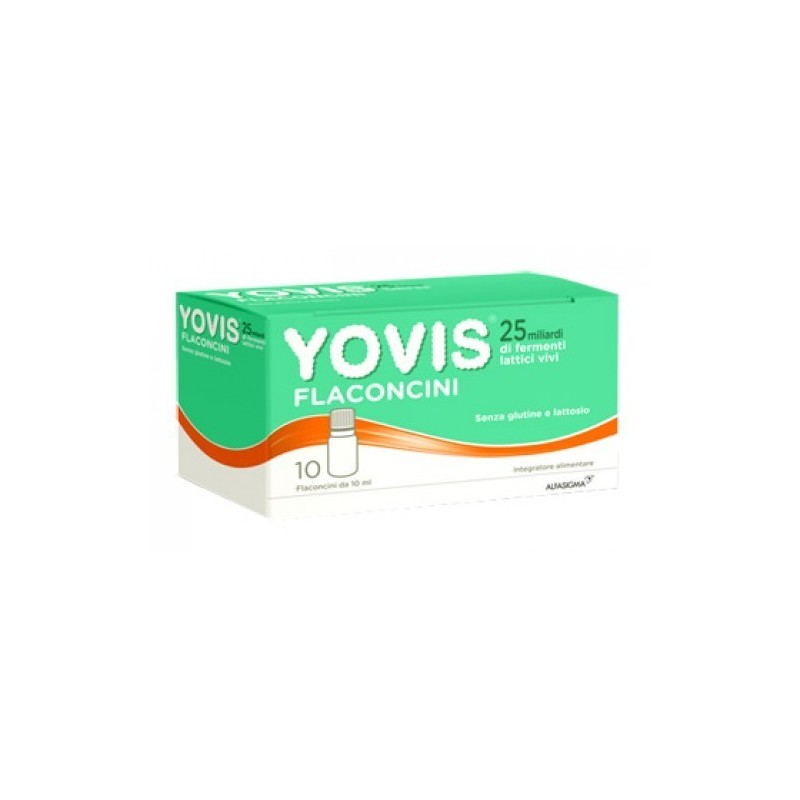 YOVISFLACONCINI Descrizione Integratore alimentare caratterizzato da un mix di bifidobatteri, streptococchi e lactobacilli, fermenti lattici vivi ad azione probiotica, appartenenti ai ceppi tra i più studiati e documentati in letteratura scientifica. La loro attività probiotica favorisce l'equilibrio della flora batterica intestinale che può risultare alterata. Yovis Flaconcini contiene questo particolare mix di fermenti lattici, nella più elevata concentrazione per un solo flaconcino: 25 miliardi.I fermenti lattici vivi contenuti in Yovis Flaconcini, una volta arrivati nell'intestino, sono in grado di aiutare la flora batterica endogena a riequilibrarsi. Questo risultato viene conseguito anche grazie all'elevata concentrazione di cellule vive: non meno di 25 miliardi per flaconcino. Ingredienti Miscela di fermenti lattici vivi: Streptococcus thermophilus Z57 (BCCM: LMG P-21908), Lactobacillus acidophilus LA1 (BCCM: LMG P-21904), Bifidobacterium breve Bbr8 (BCCM: LMG P-17501), Bifidobacterium animalis ssp. Lactis Bi1 (BCCM: LMG P-17502); antiagglomerante: sali di magnesio degli acidi grassi; acqua depurata, aroma fragola; conservanti: potassio sorbato e sodio benzoato; acido citrico; edulcorante: sucralosio. Senza glutine e senza lattosio. Caratteristiche nutrizionali Valori medi per 1 flaconcino Streptococcus thermophilus Z57 (LMG P-21908) Lactobacillus acidophilus LA1 (LMG P-21904) Bifidobacterium breve Bbr8 (LMG P-17501) Bifidobacterium animalis ssp. Lactis Bi1 (LMG P-17502)25x109 UFC* *UFC: Unità Formanti Colonia (Cellule vive). Modalità d'uso 1) Avvitare il tappo in senso orario per rompere il sigillo di sicurezza. 2) Continuare ad avvitare in senso orario fino a fine corsa. 3) Agitare bene il flaconcino fino a completa dissoluzione della polvere. 4) Svitare il tappo in senso antiorario e bere il contenuto. Si consiglia l'assunzione di 1-2 flaconcini al giorno, preferibilmente lontano dai pasti. In caso di terapia antibiotica assumere ad alcune ore di distanza dal farmaco. Avvertenze Non superare la dose giornaliera consigliata. Gli integratori non vanno intesi come sostituti di una dieta variata ed equilibrata e di un sano stile di vita. Tenere fuori dalla portata dei bambini al di sotto dei 3 anni di età. Conservazione Conservare il prodotto in luogo fresco e asciutto. Validità a confezionamento integro: 24 mesi. Formato Confezione da 10 flaconcini. Cod. 30015538