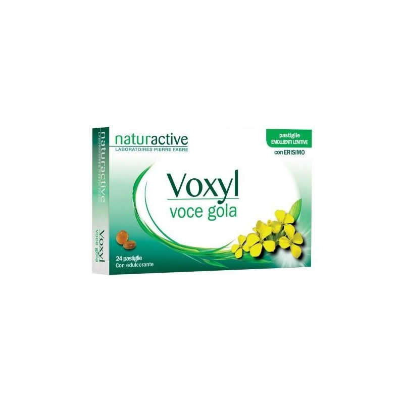 Voxyl voce golaIntegratore alimentare a base di erisimo. L'erisimo (sisymbrium officinale L., summitas c. floribus) contenuto nelle pastiglie Voxyl voce gola, è noto per le sue proprietà lenitive ed emollienti per la gola e per la sua azione sul tono della voce. Ingredienti Diluente: isomalto; estratto secco di erisimo (sisymbrium officinale l., summitas c. floribus) 15 , aroma di mora, aroma di miele, edulcorante. Senza soia e caseina. Modalità d'uso Le pastiglie Voxyl voce gola svolgono la loro azione se lasciate sciogliere lentamente in bocca. Si consiglia di assumere una pastiglia da 4 a 6 volte durante l'arco della giornata. Avvertenze Contiene una fonte di fenilalanina. Tenere fuori dalla portata dei bambini al di sotto dei tre anni. La data di scadenza si riferisce al prodotto integro e correttamente conservato. Non superare la dose giornaliera consigliata. Gli integratori non vanno intesi come sostituti di una dieta equilibrata e di un sano stile di vita. Un consumo eccessivo può avere effetti lassativi. Per donne in gravidanza o allattamento e bambini, si raccomanda di sentire il parere medico. Conservazione Conservare in un luogo fresco, asciutto, lontano da fonti di calore e al riparo dalla luce. Formato Peso netto: 60 g. Contiene 24 pastiglie in blister da 2,4 g. Cod.709356