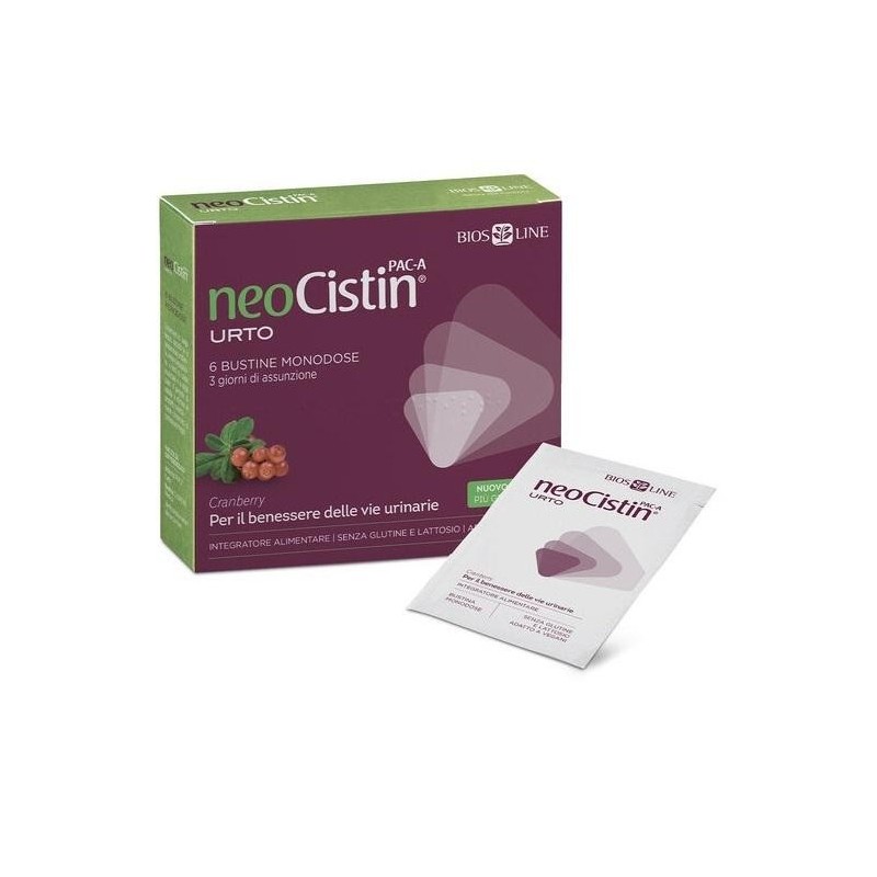neoCistin PAC-A URTO Descrizione Integratore alimentare con estratto di Cranberry ad alto titolo in ProAntoCianidine di tipo A, mannosio, quercetina e Coleus. Grazie al suo alto contenuto di cranberry, svolge un’azione utile per il ripristino delle fisiologiche funzioni delle vie urinarie. L’estratto di cranberry utilizzato è ad alto titolo di ProAntoCianidine di tipo A (PAC-A) prevalentemente in forma dimerica e trimerica, a più basso peso molecolare e quindi più assorbibili. Completano la formula il D- mannosio, la vitamina C, l’olio essenziale di melaleuca, la quercetina e l’estratto di Coleus titolato in forskolina. Ingredienti Maltodestrine, D-mannosio, sorbitolo, aroma, vitamina C (acido L-ascorbico); colorante: rosso di radice di barbabietola; cranberry (Vaccinium macrocarpon Aiton) frutto e.s. tit. al 36% in ProAntoCianidine totali di cui 85% in ProAntoCianidine di tipo A (PAC-A), quercetina, Coleus (Plectranthus barbatus Andrews) radice e.s. tit. al 10% in forskolina; acidificante: acido citrico; agente antiagglomerante: biossido di silicio; edulcorante: glicosidi steviolici da stevia; melaleuca [Melaleuca alternifolia (Maiden & Betche) Cheel] olio essenziale. Senza glutine e lattosio. Caratteristiche nutrizionali Valori medi per 2 bustine %VNR* D-mannosio 2.600 mg   Cranberry frutto e.s. tit. al 36% in PACpari a PACdi cui PAC di tipo A 360,0 mg129,6 mg110,2 mg   Coleus radice e.s.tit. al 10% in forskolina 150 mg15 mg   Quercetina 200 mg   Vitamina C 360 mg 450 Melaleuca o.e. 3 mg   *Valori Nutritivi di Riferimento. Modalità d'uso 2 bustine al giorno, lontano dai pasti; 1 bustina alla mattina appena svegli e 1 bustina alla sera prima di coricarsi, da sciogliere in un po' d'acqua (almeno 100 ml) e bere subito. Per un’azione ottimale del prodotto, si raccomanda di bere poca acqua per circa un’ora dopo l’assunzione; in seguito bere abbondante acqua, almeno 2 litri nell’arco della giornata. Nel caso in cui i disturbi alle vie urinarie si presentassero con frequenza a seguito di rapporti sessuali, si consiglia di assumere 1 bustina dopo il rapporto e 1 bustina dopo circa 12 ore, seguendo le modalità esposte sopra. Avvertenze Tenere fuori dalla portata dei bambini al di sotto dei 3 anni. Non superare la dose giornaliera consigliata. Gli integratori non vanno intesi quali sostituti di una dieta variata, equilibrata e di un sano stile di vita. Conservazione Conservare in luogo fresco, asciutto e a temperatura ambiente; evitare l'esposizione a fonti di calore localizzate e ai raggi solari. Il periodo di validità si riferisce al prodotto correttamente conservato, in confezione integra. Validità a confezione integra: 36 mesi. Formato Confezioni da 6 bustine. Peso netto: 27 g. Cod. BL4705